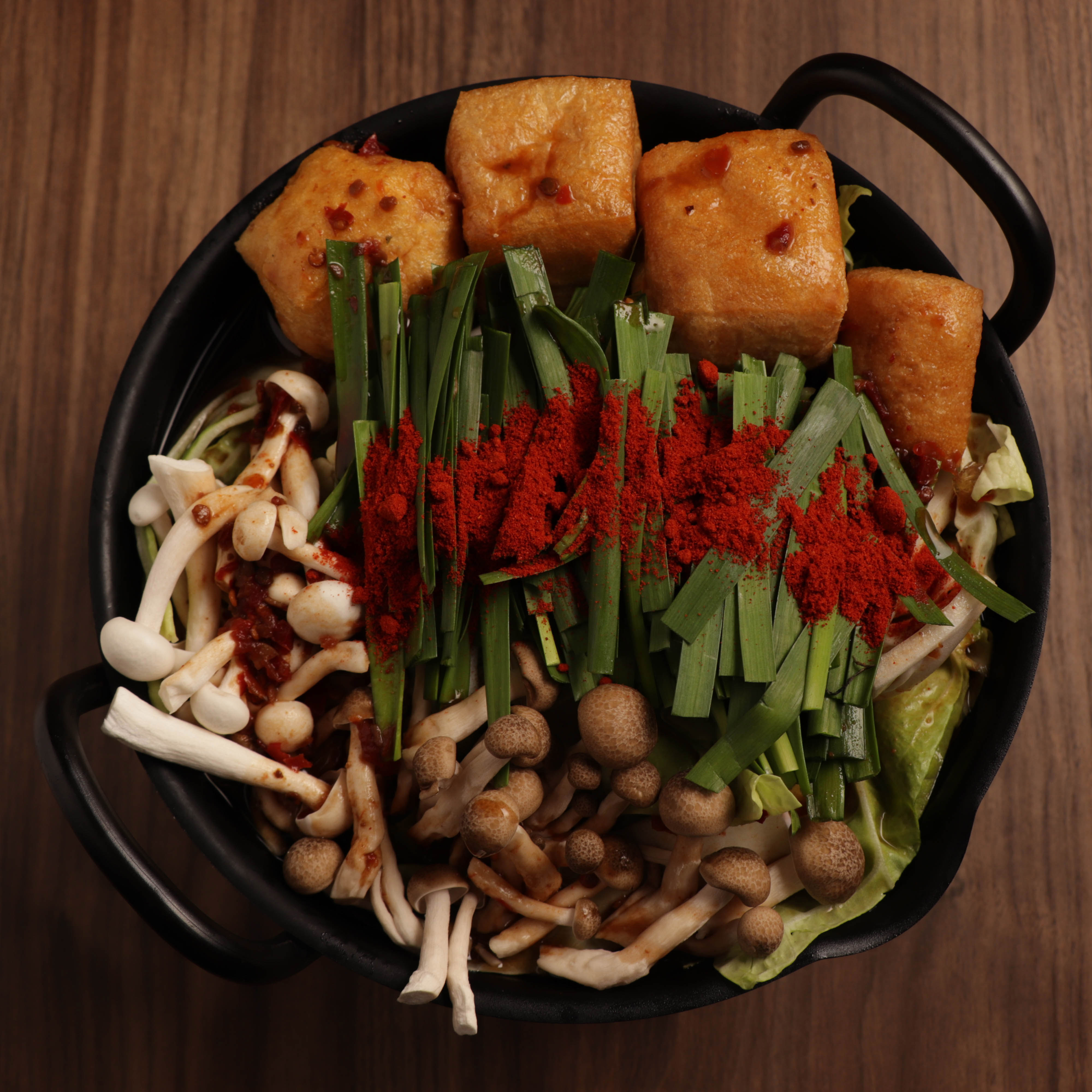 2. 按喜好放入材料,鋪上豆包與韭菜,撒上辣椒粉,即可。