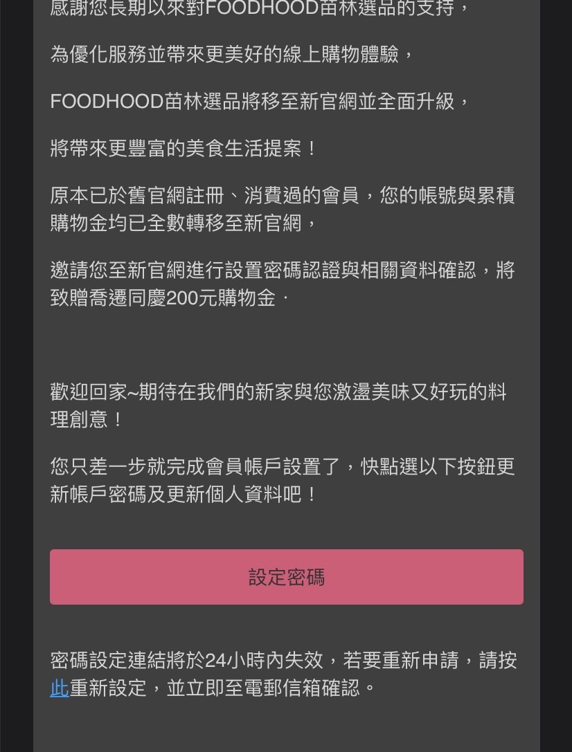 信件主旨:【FOODHOOD苗林選品】我們搬新家囉!邀請會員們到全新官網更新帳戶資訊