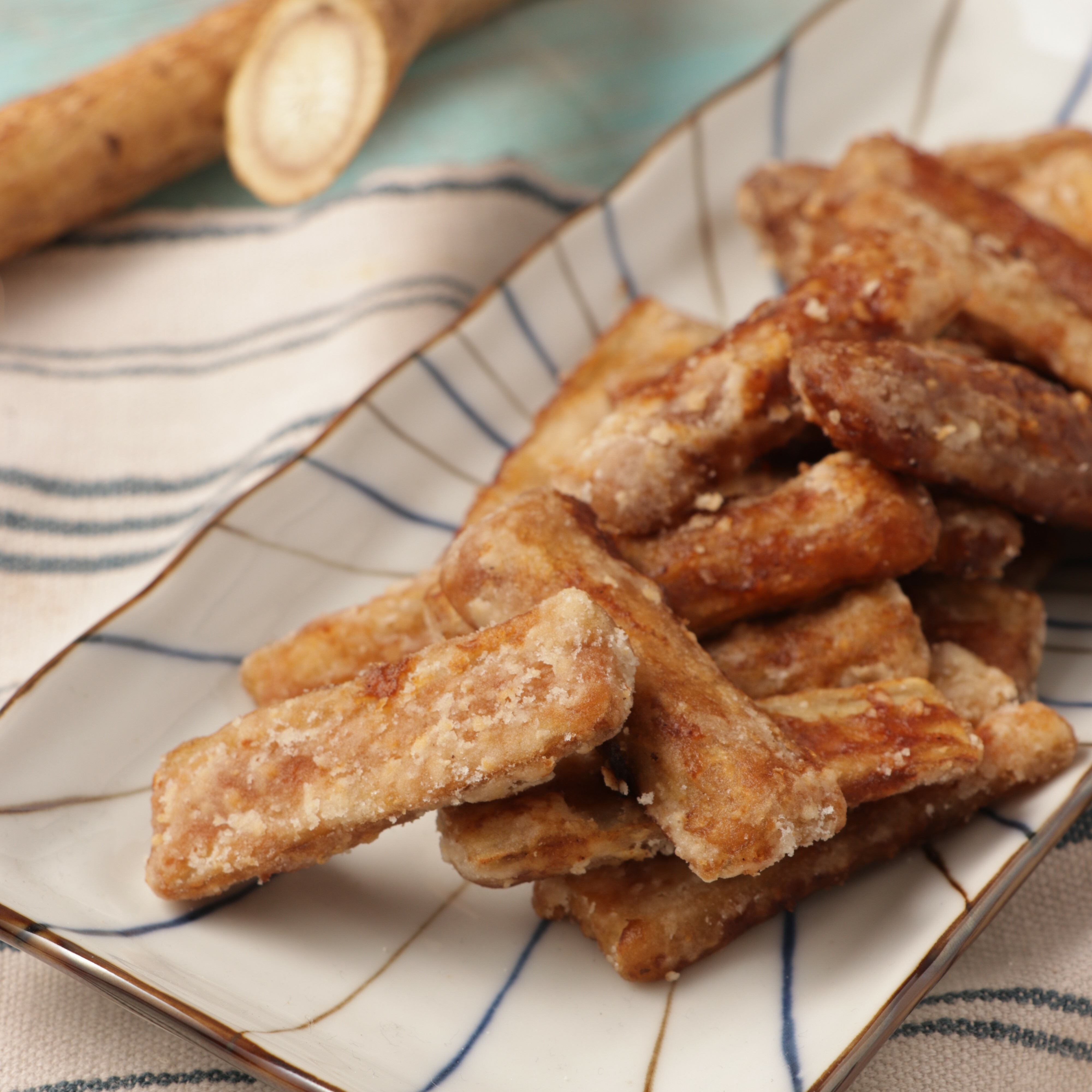 2.將牛蒡取出沾裹太白粉。(留下醬汁)