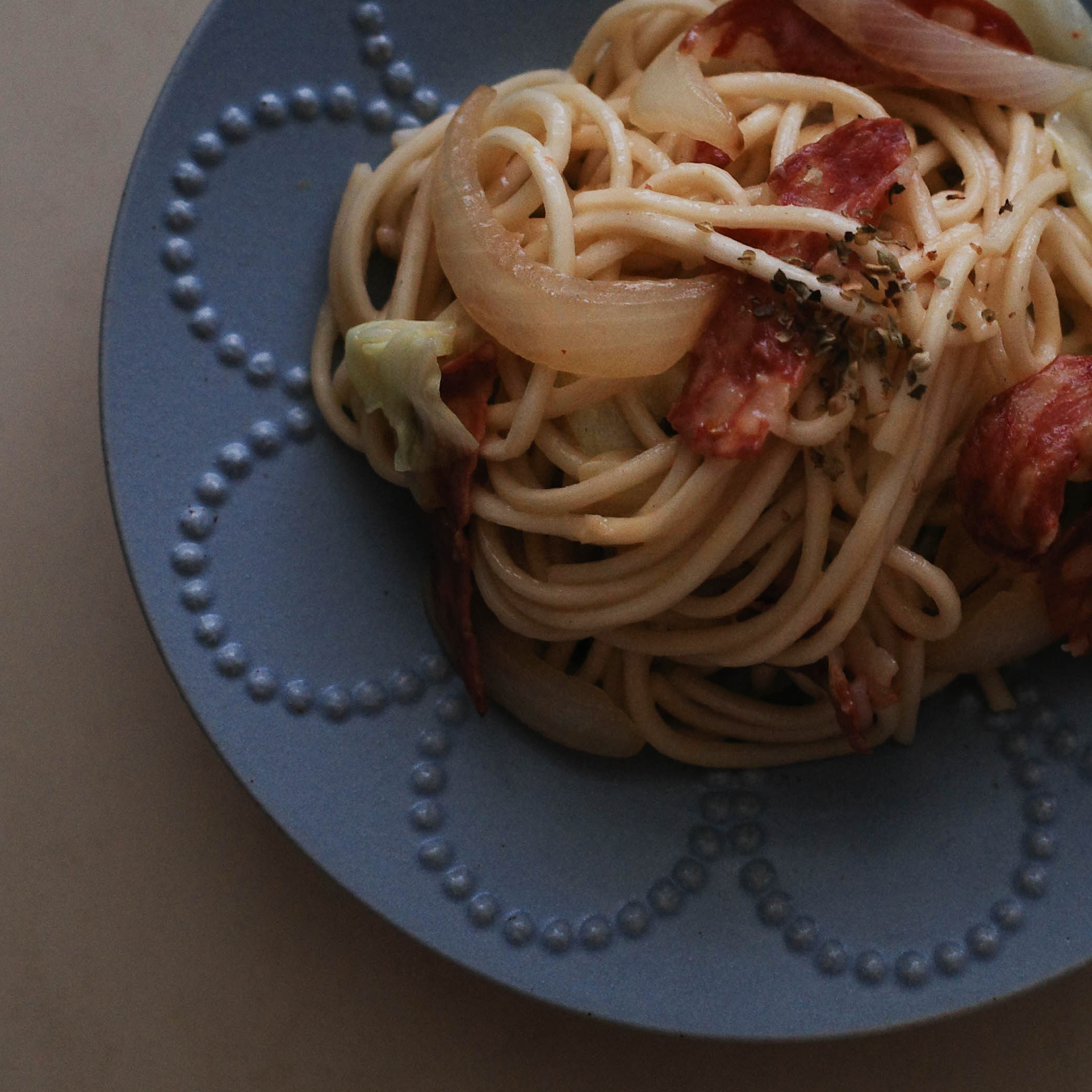 3. 起油鍋,將蒜頭爆香、洋蔥炒至軟化透明,加入半生麵、高麗菜與風乾熟成肉片拌炒,倒入KENKO蒜味奶油醬、鎌田醬油鮭魚高湯醬油、水拌炒至麵條完全吸附醬汁,即可盛盤上桌。