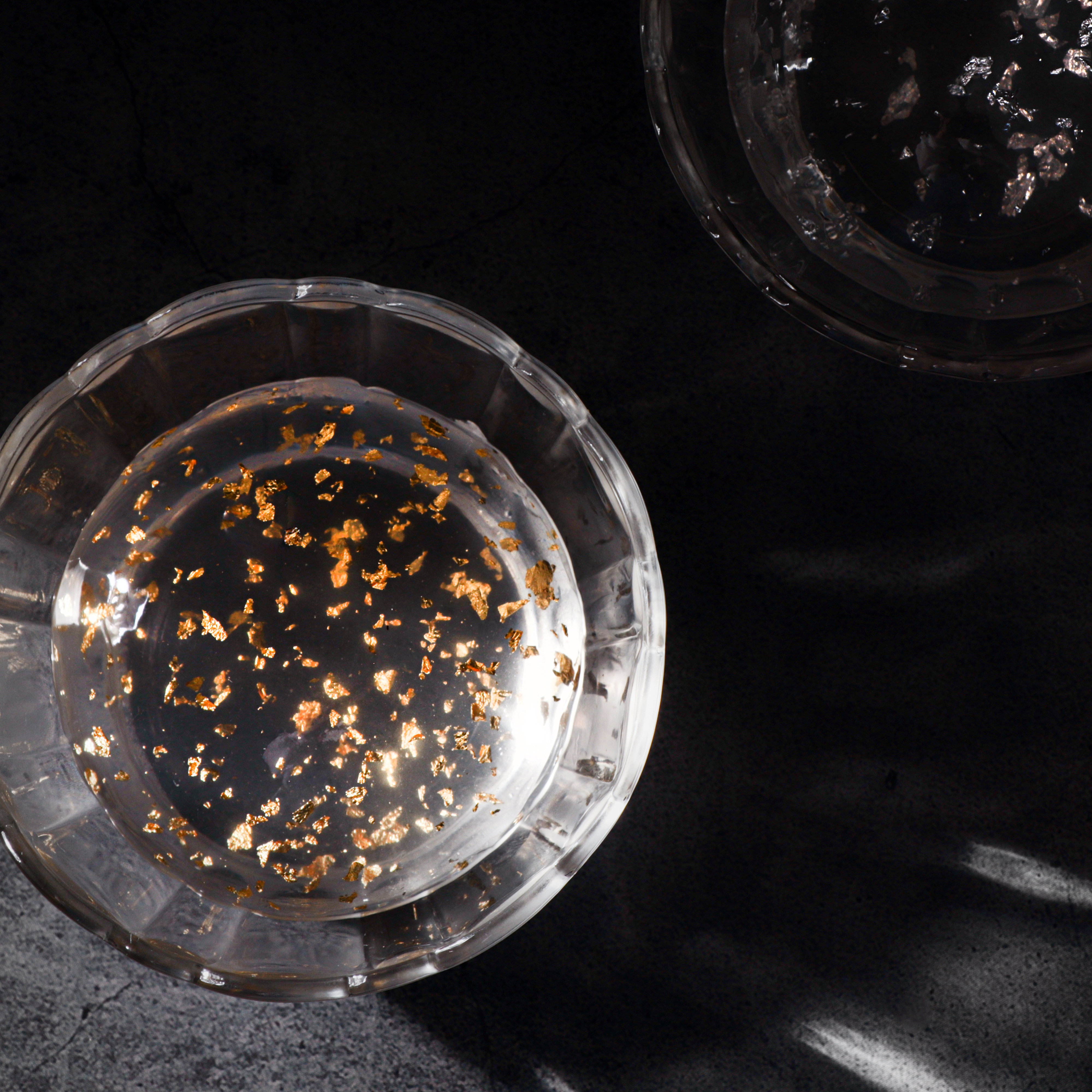 3. 離火,盛裝入容器,待其冷卻後點綴金箔或銀箔,避免金箔與銀箔集中沉於一側,冷藏三小時。
