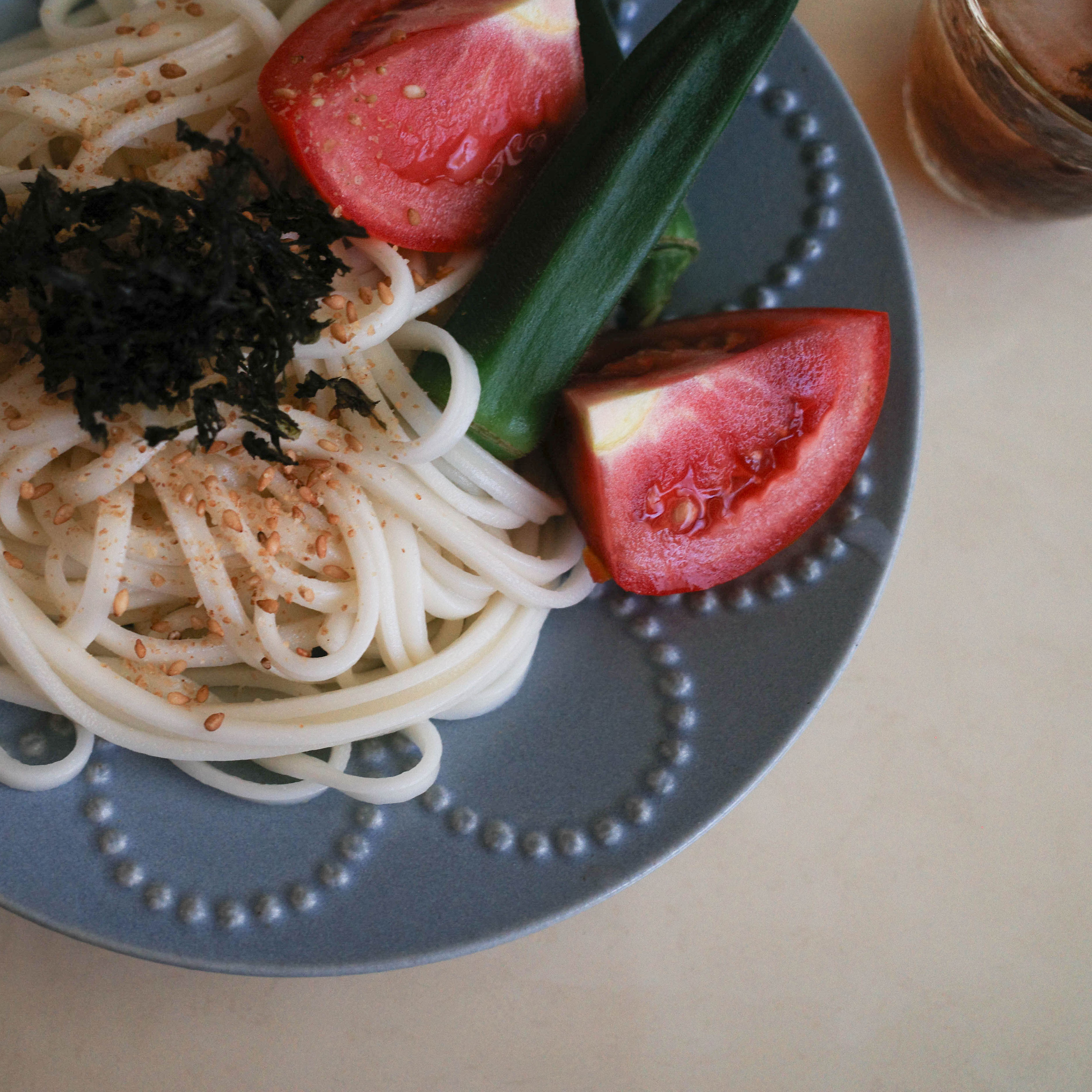 3. 於Q彈冰涼的烏龍麵撒上金芝麻與花海苔,擺放番茄與川燙後的秋葵,搭佐醬汁沾食。