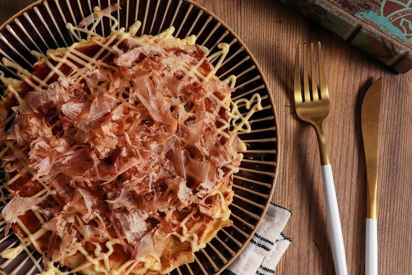 3. 大阪燒盛盤,抹上大阪燒醬、擠美乃滋、放上紅薑片及柴魚片即完成。