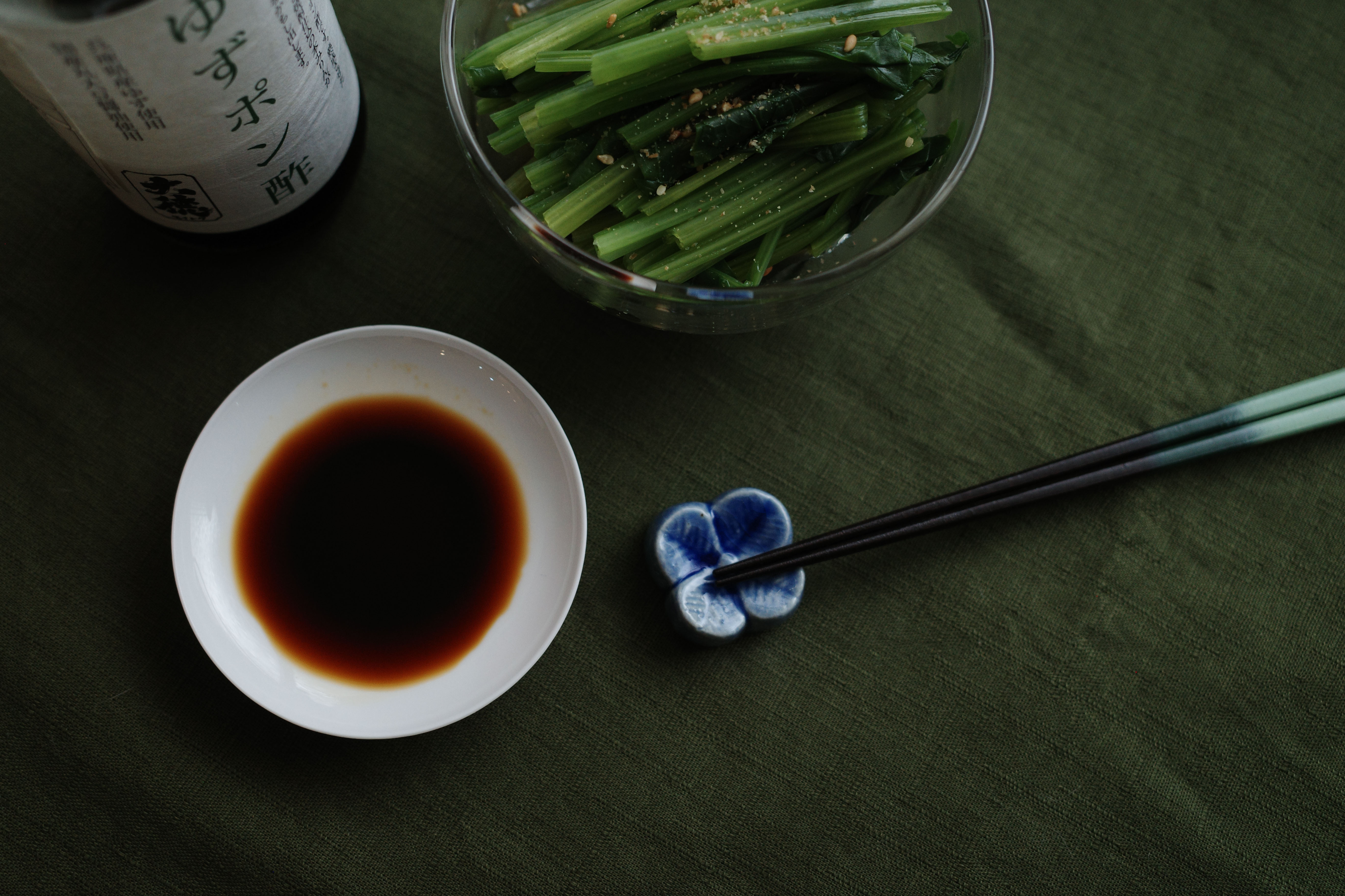 在清燙過的小菜上撒點芝麻、澆淋柑橘醋醬油,搭配涼拌後的手工豆腐,沾取熟成醬油,剛好為冷暖交替的春末做了接壤。