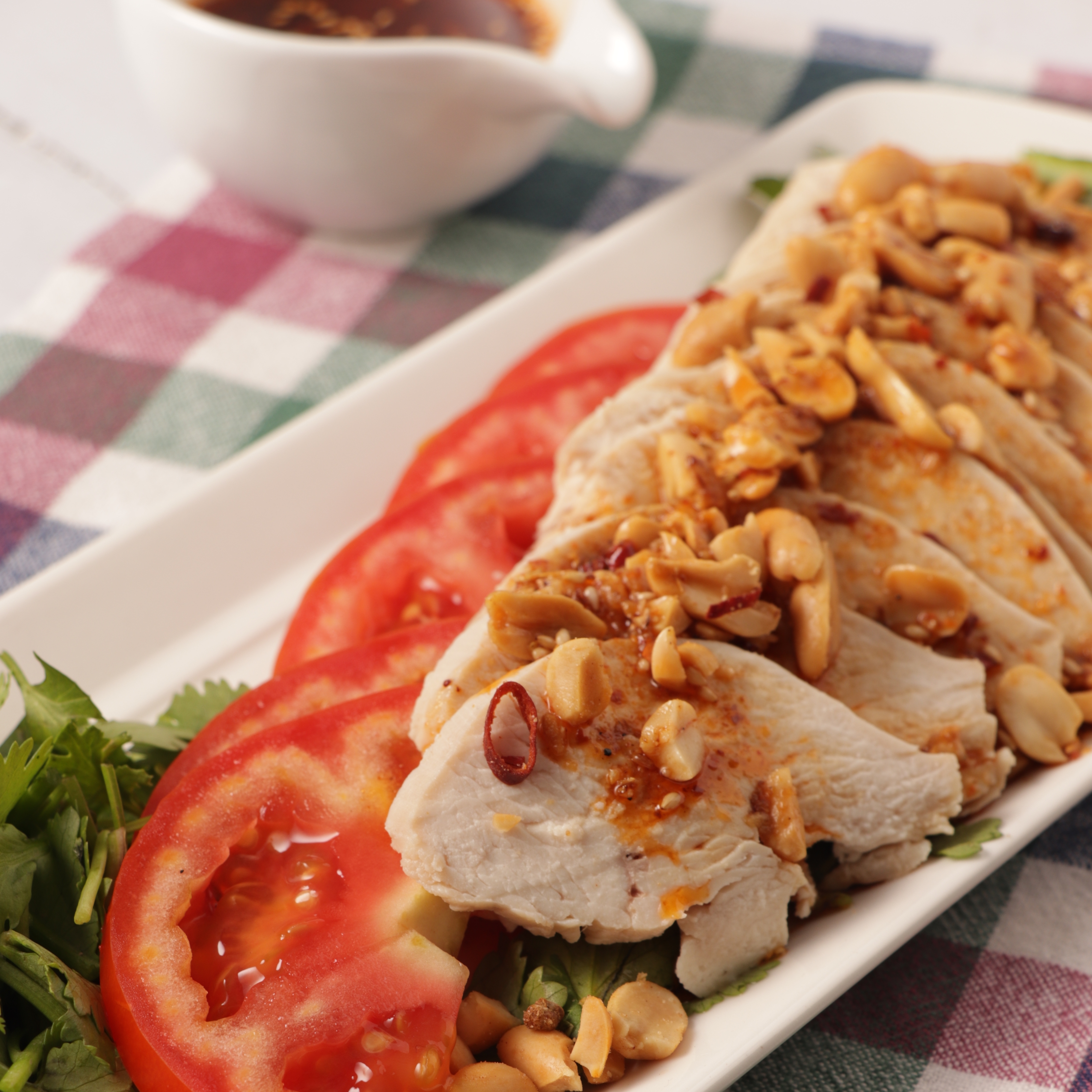 2.將雞肉切成0.5公分的厚度,將番茄、香菜、雞肉擺盤,淋醬汁,撒麻辣花生。