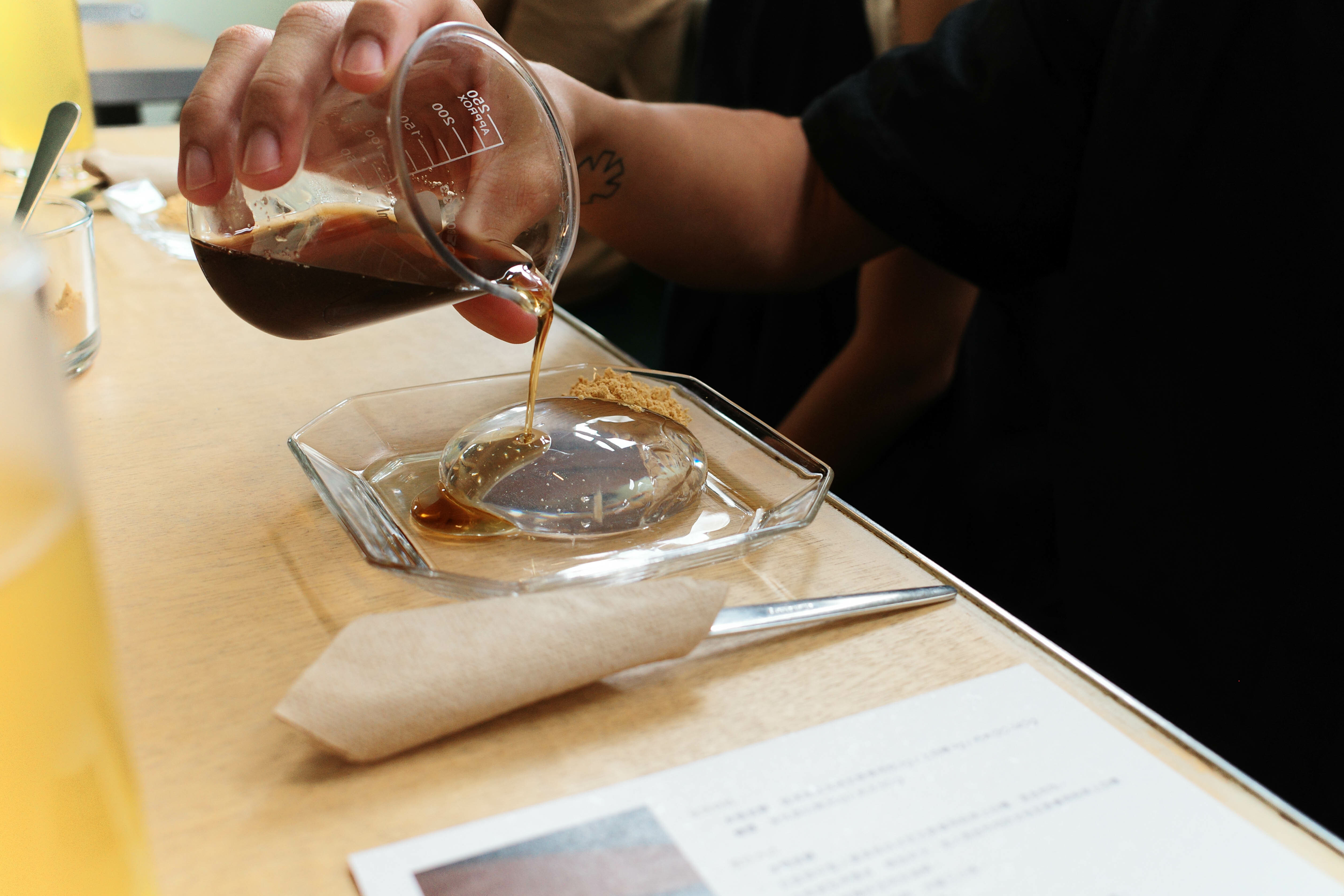 抽掉所有複雜元素,因而得以品嘗細微口感變化的水信玄餅,意外地讓亨利卡關許久,「還不足夠認識水信玄餅之前,我也曾以為,他就是一顆沒有味道的果凍。品嘗過本格派的、水潤質地的水信玄餅之後,才明白每個環節的細微調整,都會為他帶來偌大的變化。」亨利分享,由於新竹與台南的水質軟硬程度有別,即使是相同比例的配方,水信玄餅的成形軟硬度竟有很大的差異,「南部的水質本來就比較硬,除了成形的水信玄餅偏硬之外,水裡原有的固形物,也讓水信玄餅變得白濁、不若印象中的透明。」
