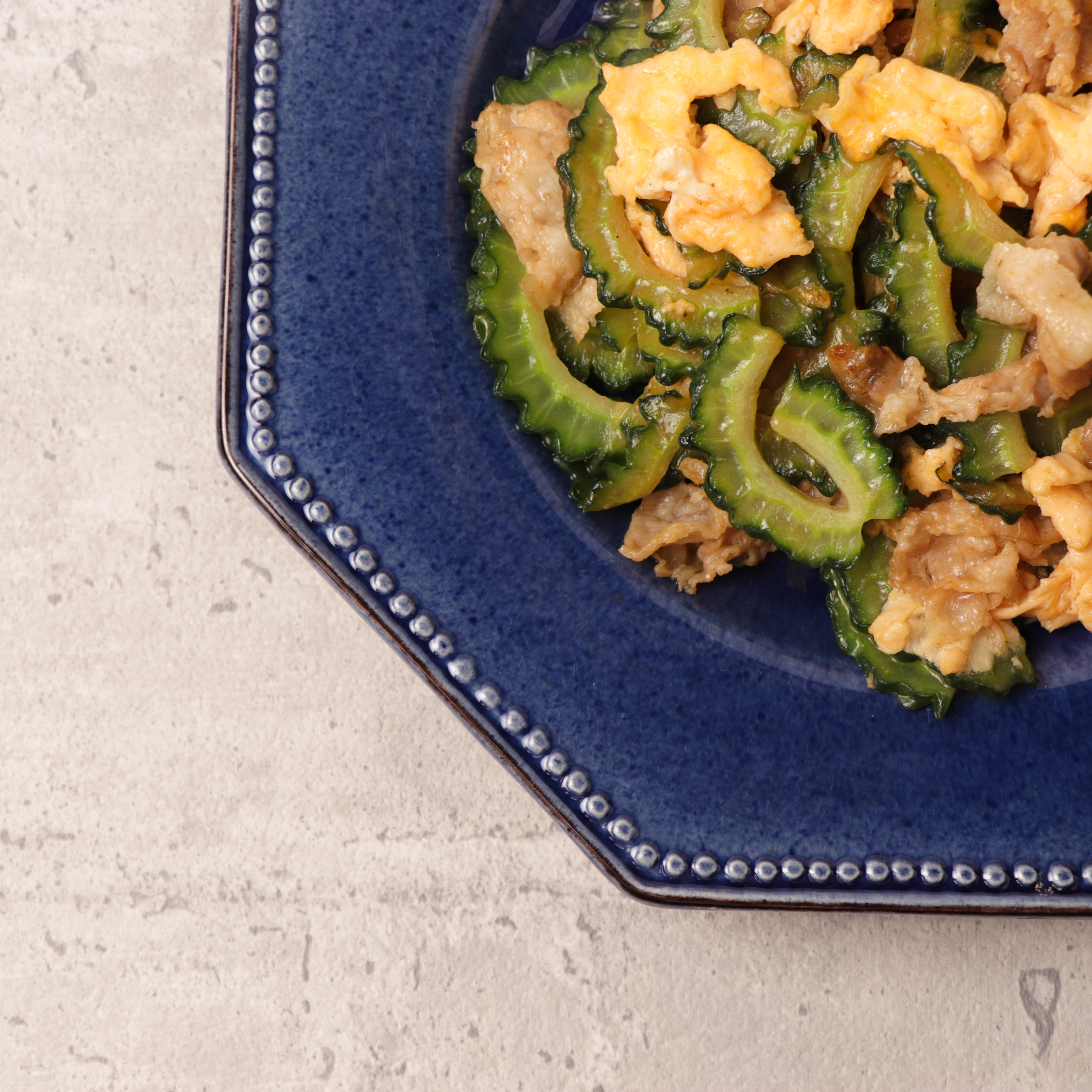 4. 另起平底鍋,加熱,倒入淡口芝麻油,開大火放入醃漬好的豬肉、蒜味醬油、米酒,拌炒至上色,再加入醃漬好的山苦瓜拌炒,瀝乾鍋中汁液後,加入半熟蛋炒勻,即可盛盤。